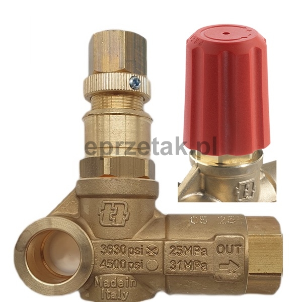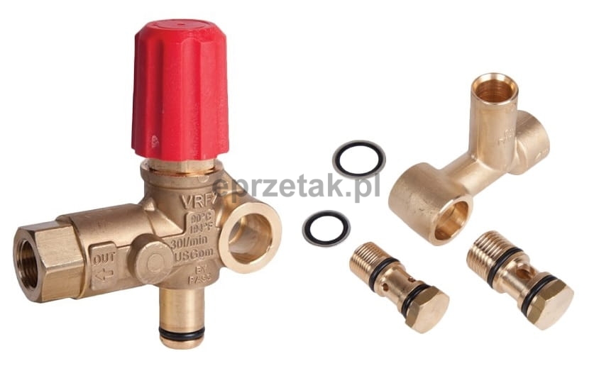 Zawór regulacji ciśnienia wykonany z mosiądzu. Pokrętło umożliwia płynną regulację ciśnienia, które jest przekazywane z głowicy do wylotu - pistoletu. Pełni również funkcję zaworu bezpieczeństwa - zgromadzony nadmiar ciśnienia w wyniku uszkodzenia wyłącznika przekazywany jest do dolotu wody.